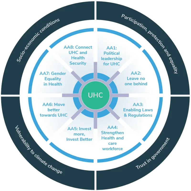 UHC2030’s tracking efforts are anchored in its analytical framework, which maps out some key political commitments endorsed by Heads of States and Governments at the 2023 United Nations high-level meeting on UHC through the lens of stakeholders’ priorities presented in the Action Agenda from the UHC Movement. Relevant indicators were carefully selected to assess progress on the implementation of commitments and they are structured into the eight action areas of the UHC Action Agenda. The framework also reflects broader contextual factors that influence the implementation and advancement of UHC in each country.